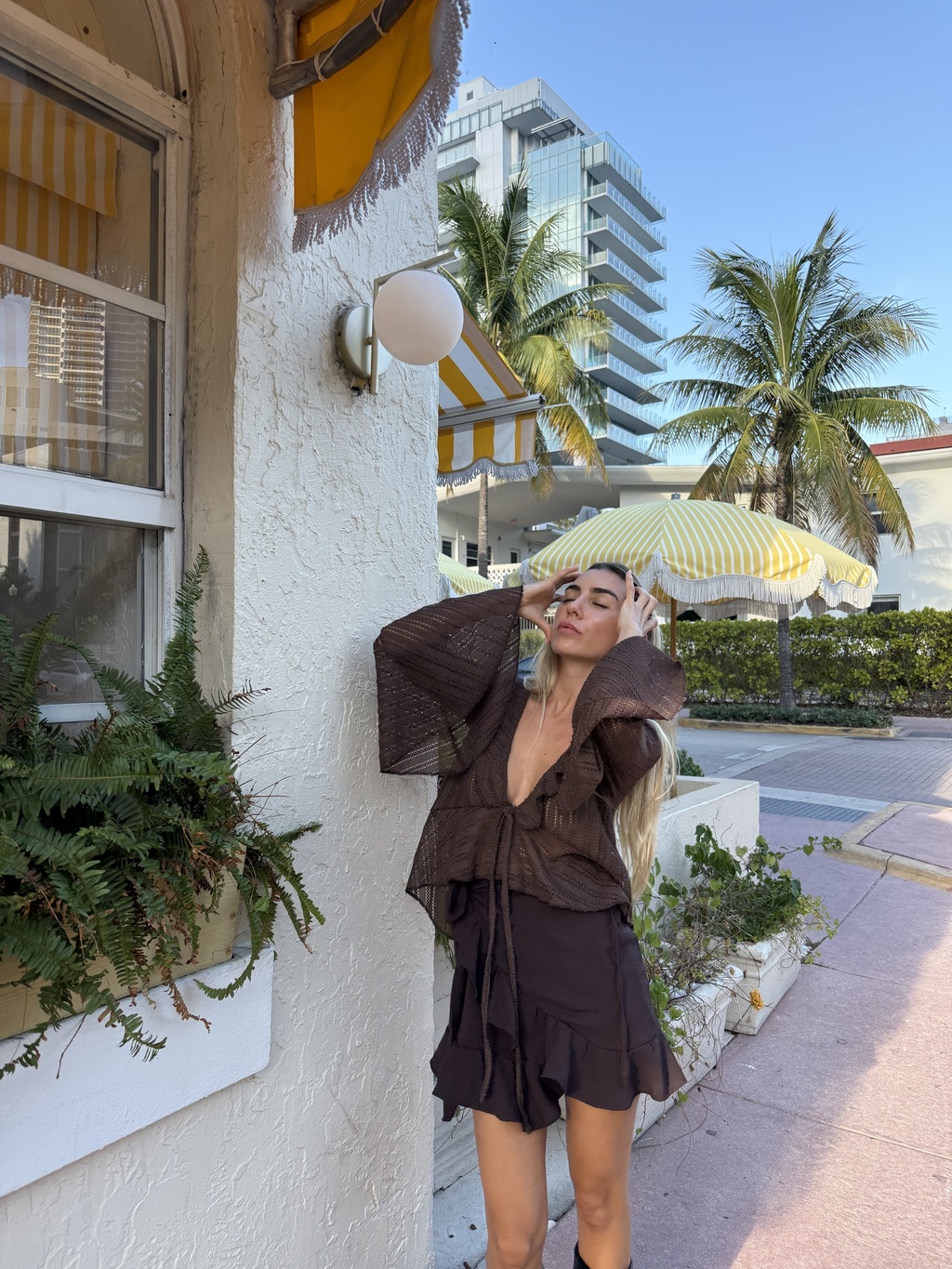 Blusa con mangas acampanadas y volados en escote, y lazos para atar y anudar en frente o cruzar tipo portafolio.