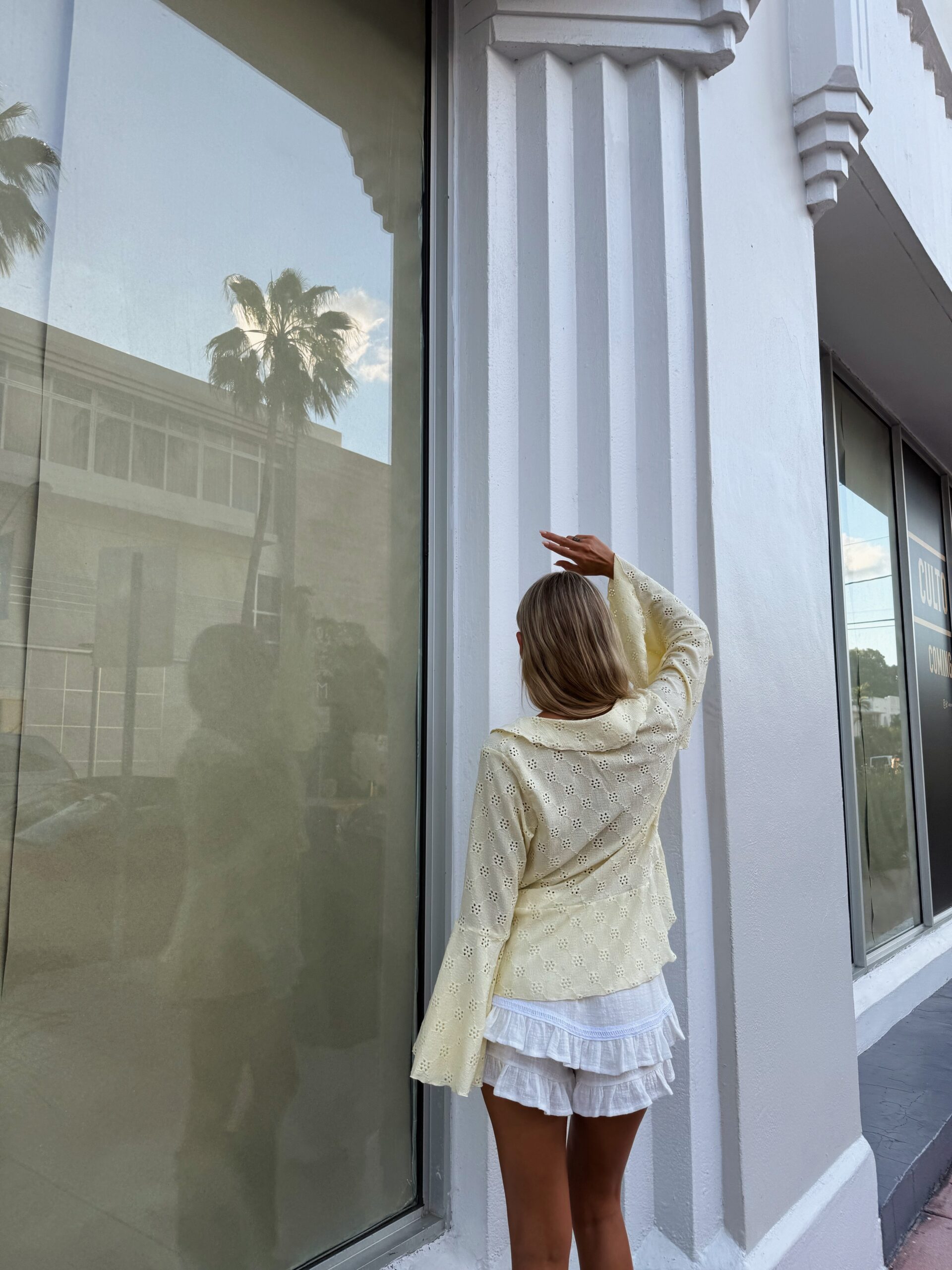Blusa con mangas acampanadas y volados en escote, y lazos para atar y anudar en frente o cruzar tipo portafolio.