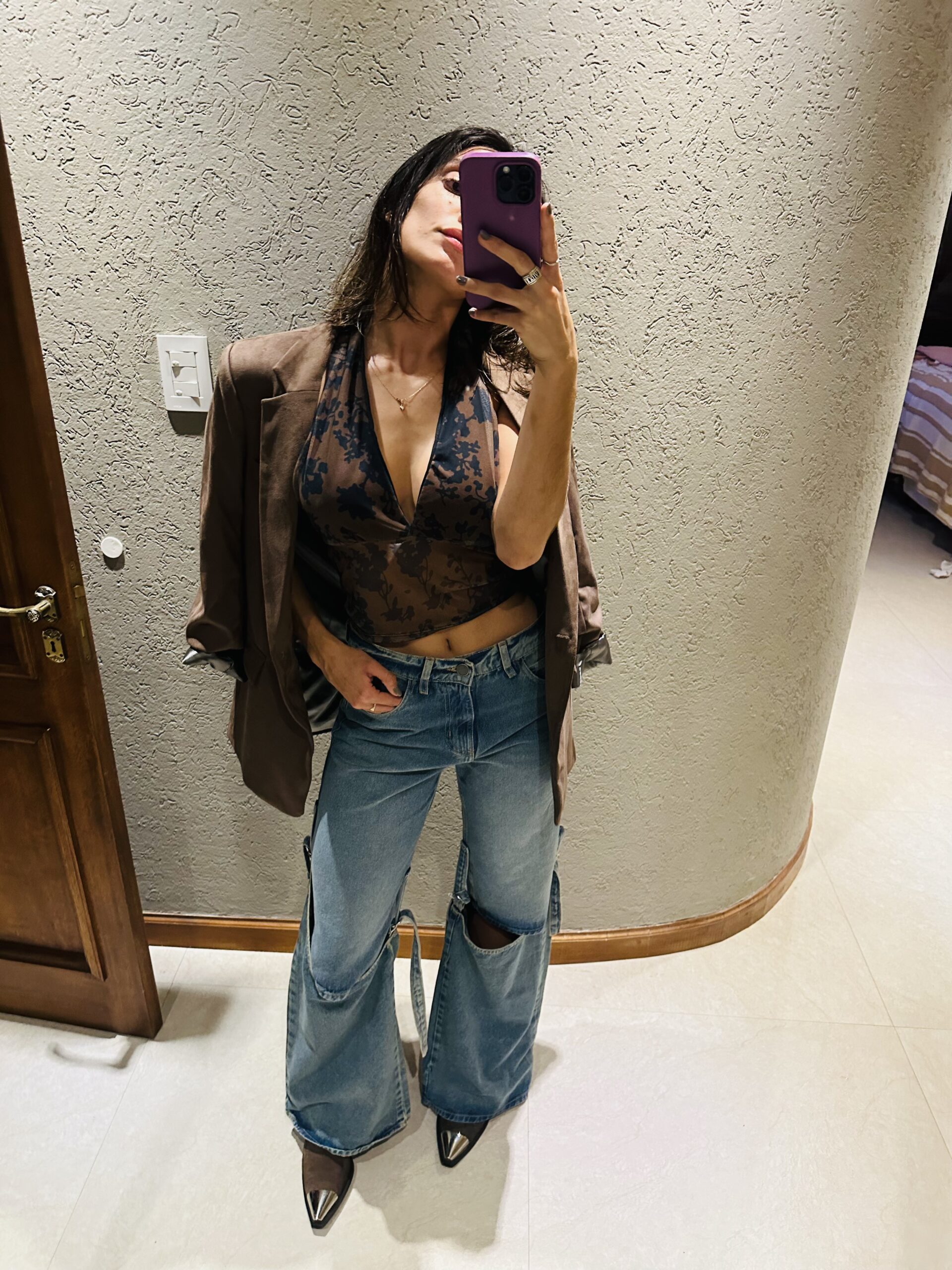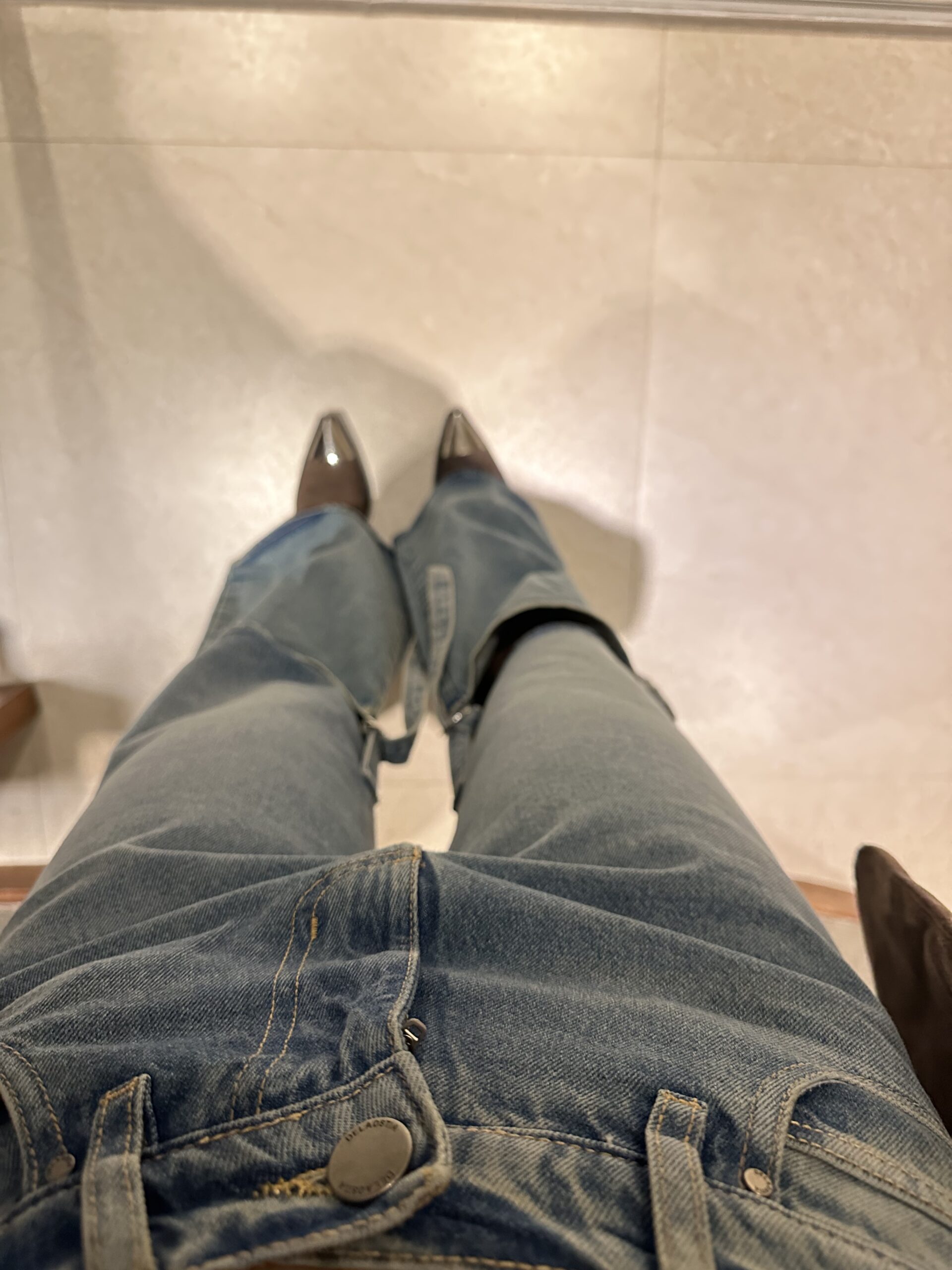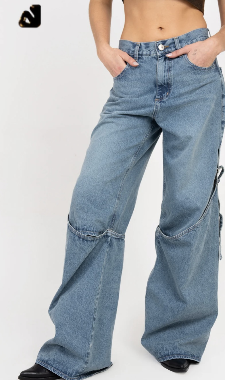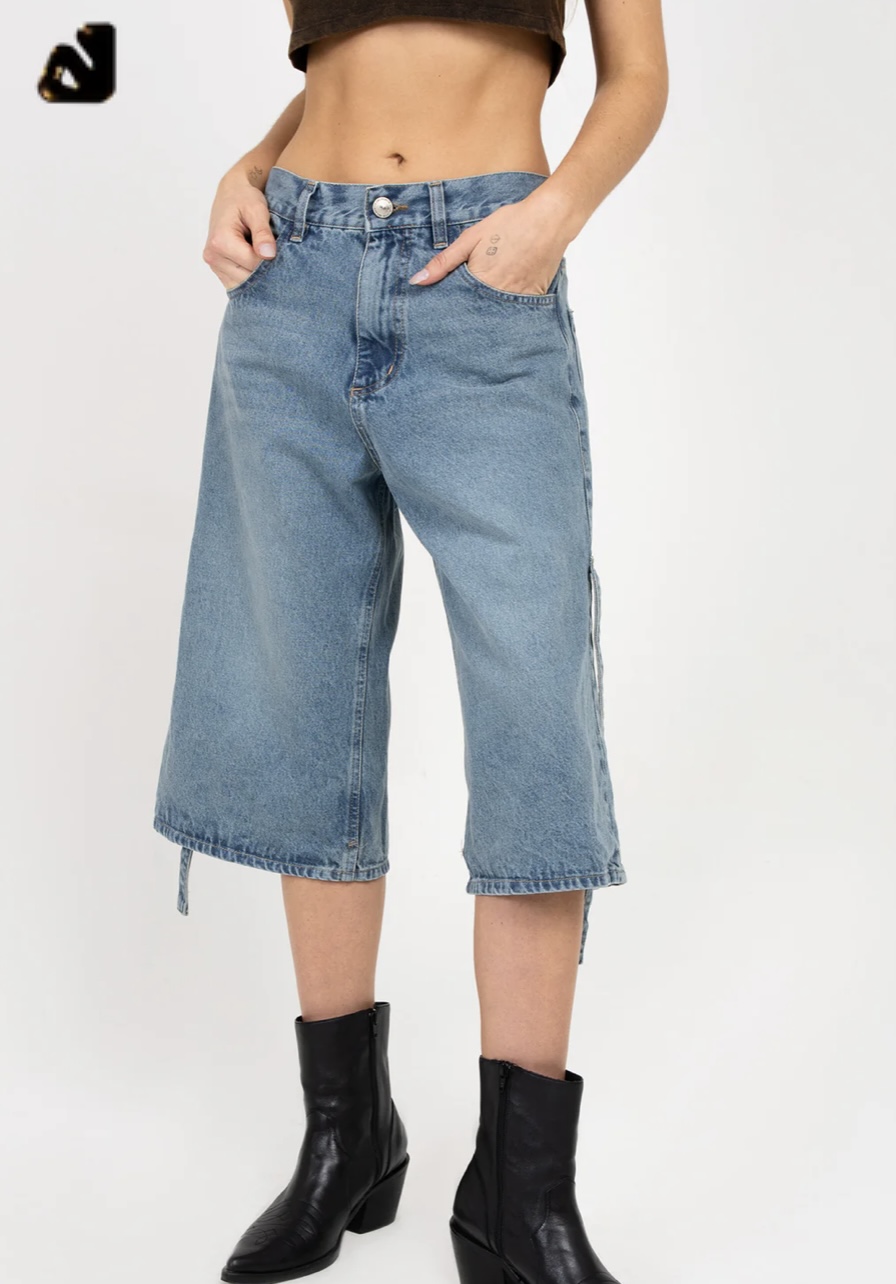 Descripción: Jean tiro medio de dos piezas unidas entre sí con hebillas. Lavado celeste claro con tintes amarillo óxido. Es desmontable, se convierte en bermuda.