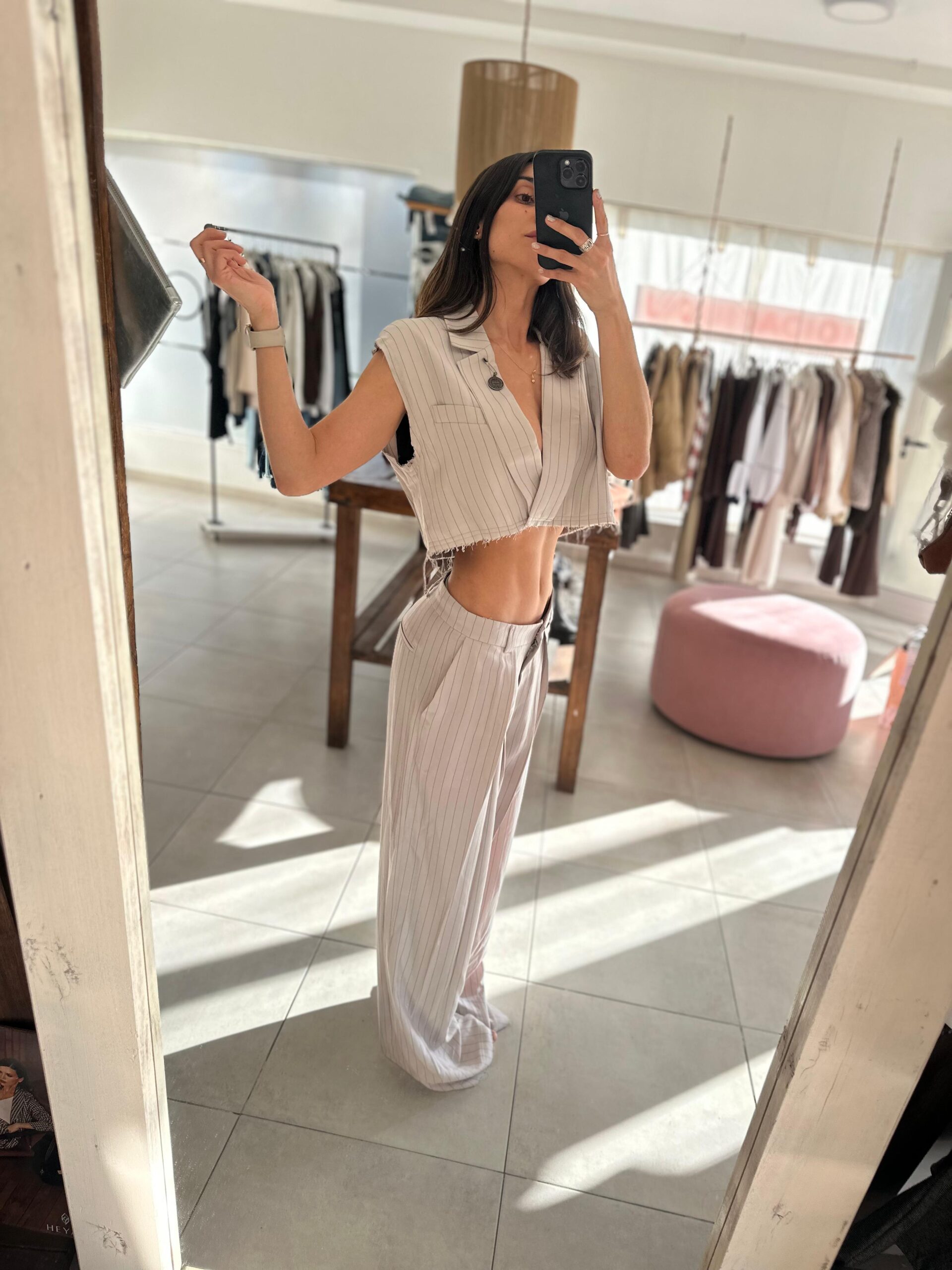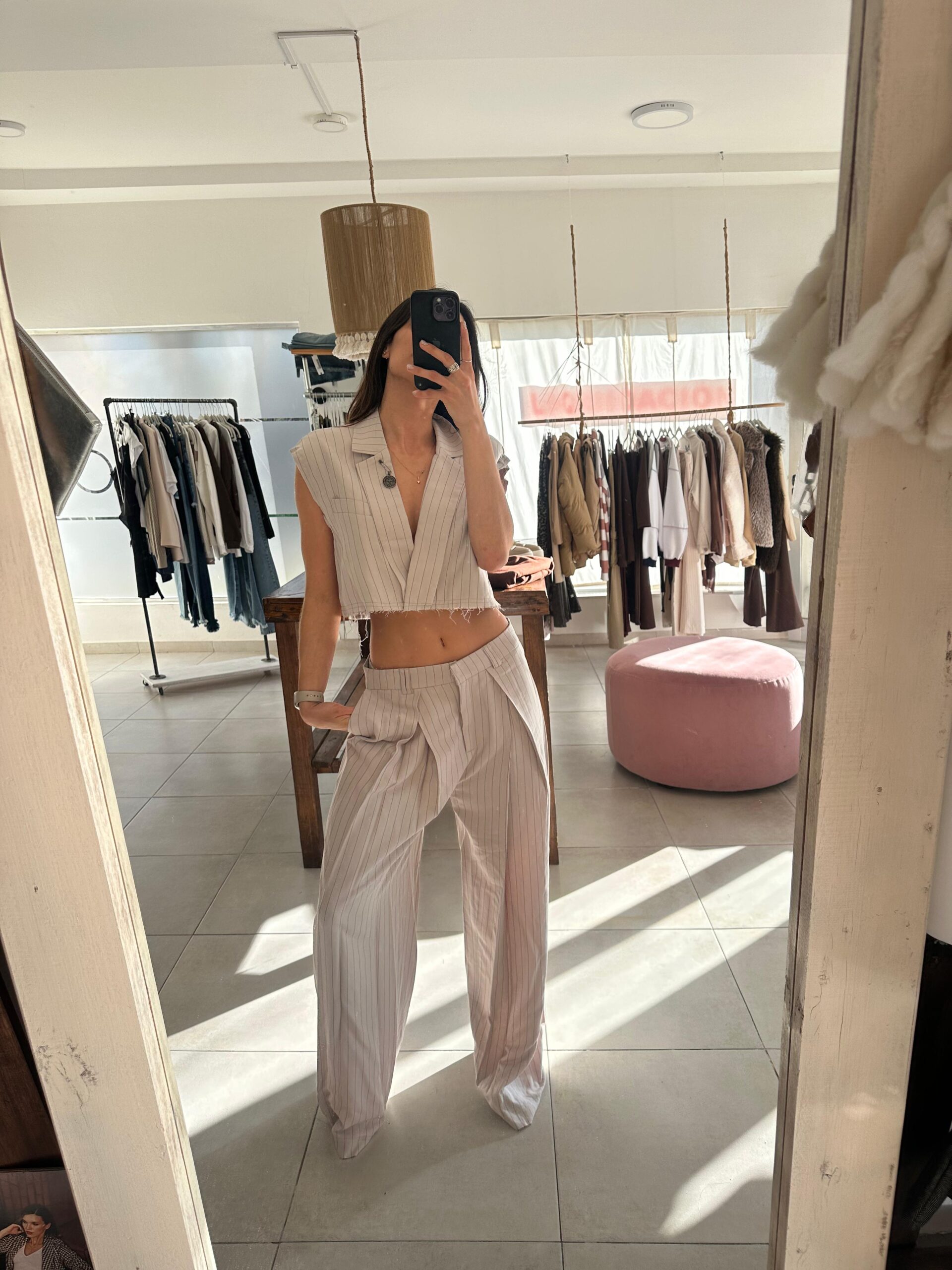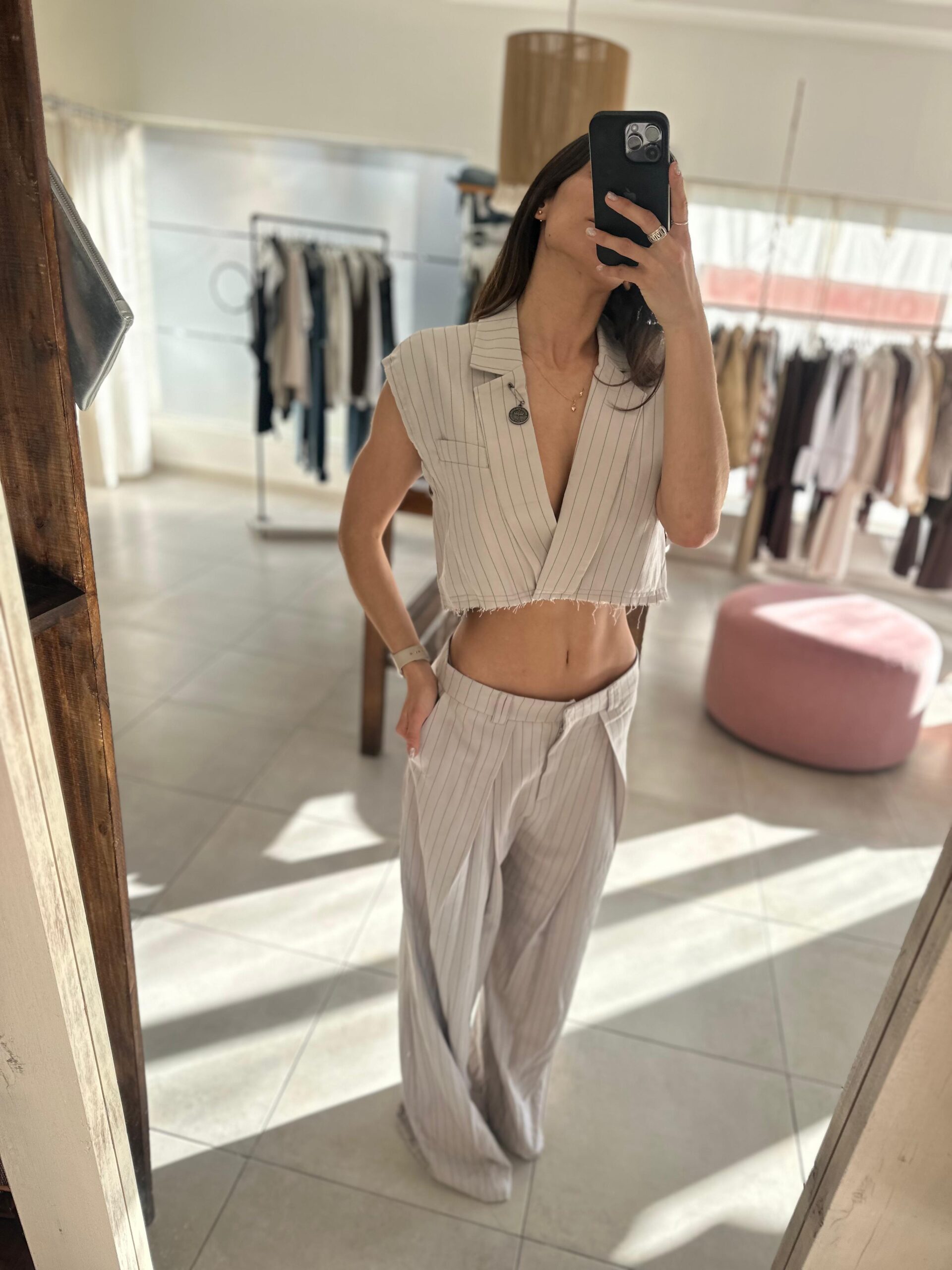 Pantalón sastrero rayado color gris, tiro medio con calce ancho tipo palazzo. Cintura con pasacinto y cartera de cierre con broche pantalonero. Bolsillo delantero lateral, Pierna amplia y ancha que termina con ruedo deshilachado con pespunte de refuerzo. Largo hasta el tobillo. Llevalo con su chaleco en conjunto!