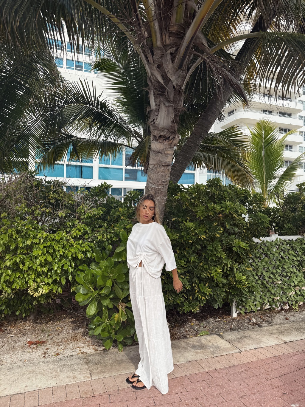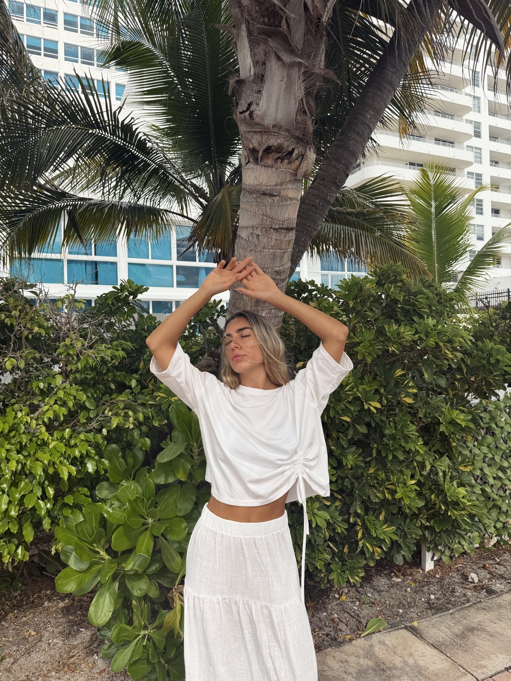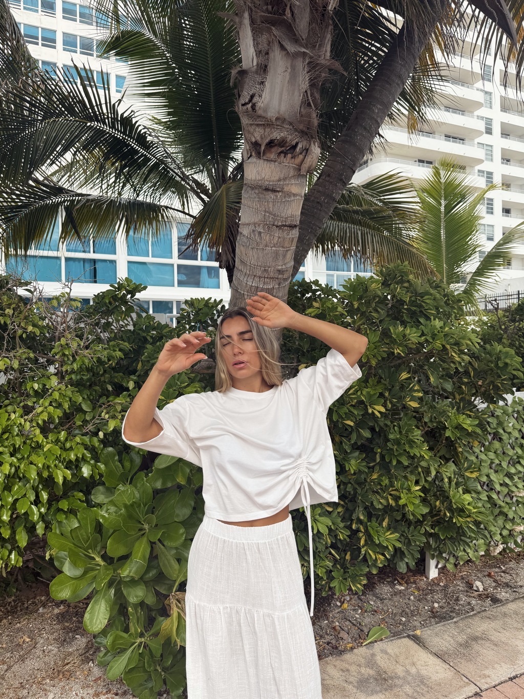 Reme oversize, manga corta, con lazos en delantero para fruncir, escote redondo.