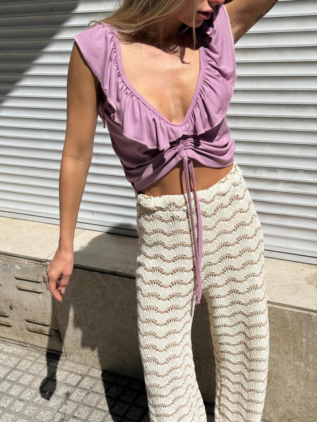 Top con volados en los breteles y escote con lazos delanteros para fruncir y acortar.