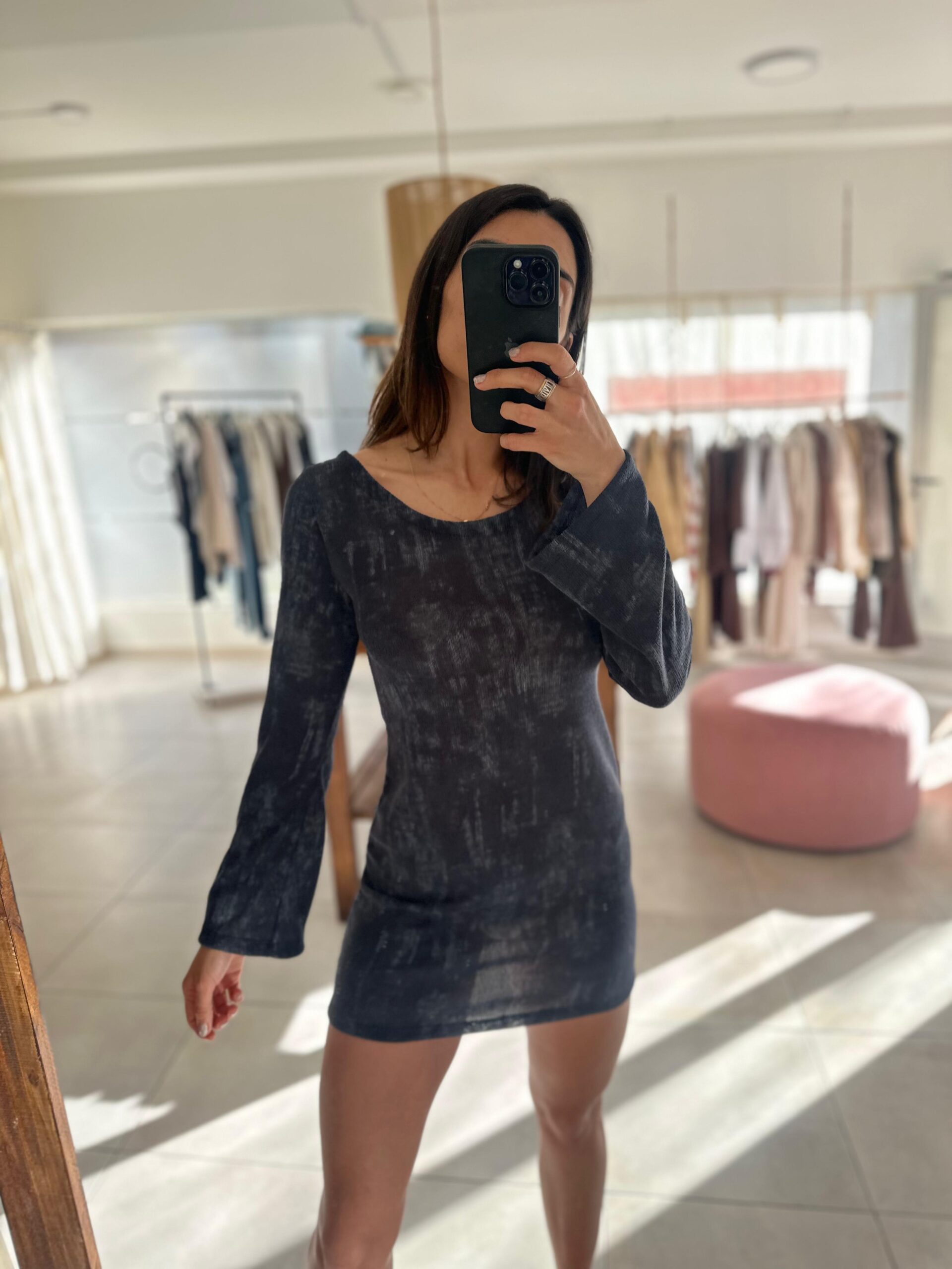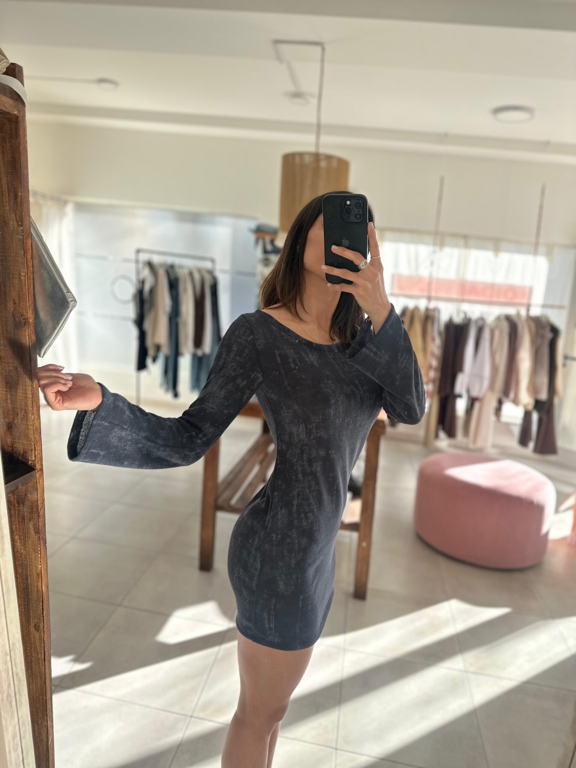Vestido corto, manga larga, escote bote.
