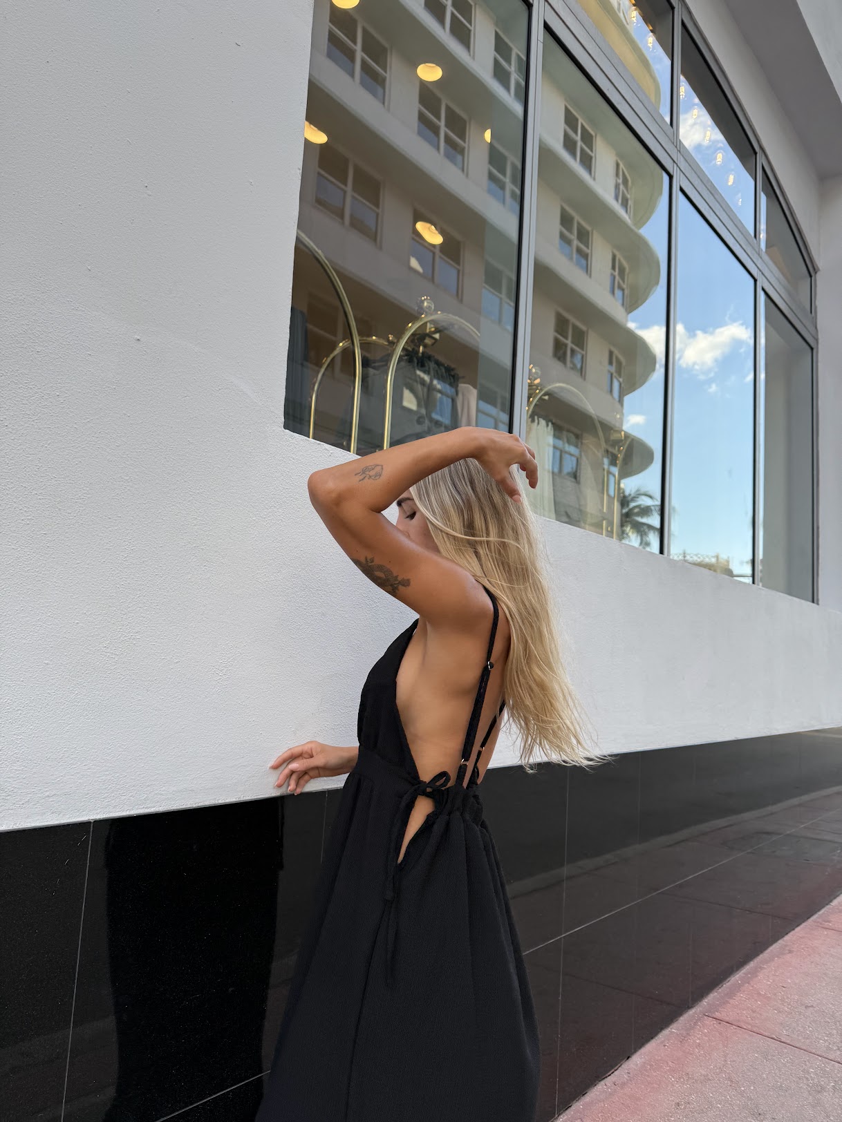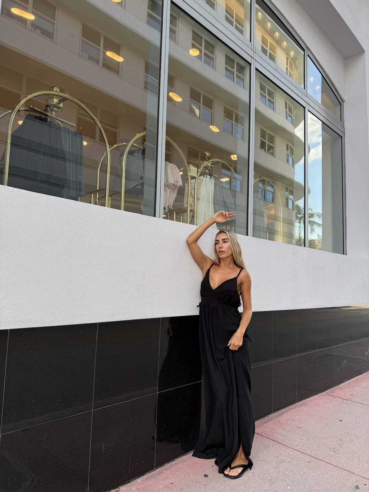 Vestido largo con espalda descubierta, escote profundo, tazas forradas, aperturas laterales y lazos para cerrarlos, tajos en falda. Los breteles son regulables.